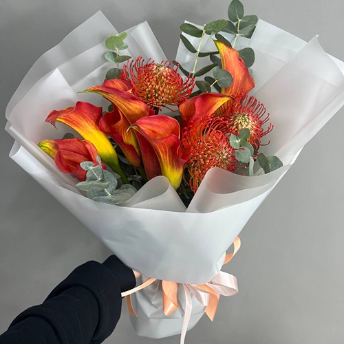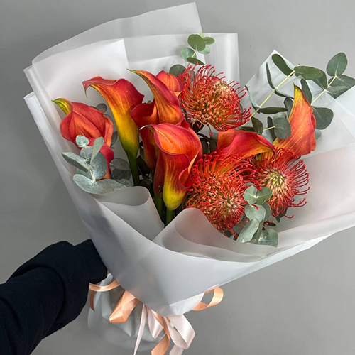 Букет "Империал" из калл, лейко и эвкалипта